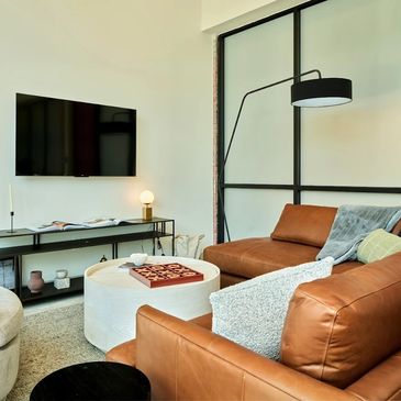 Modern space with fully-equipped kitchen, large TV, and cozy seating